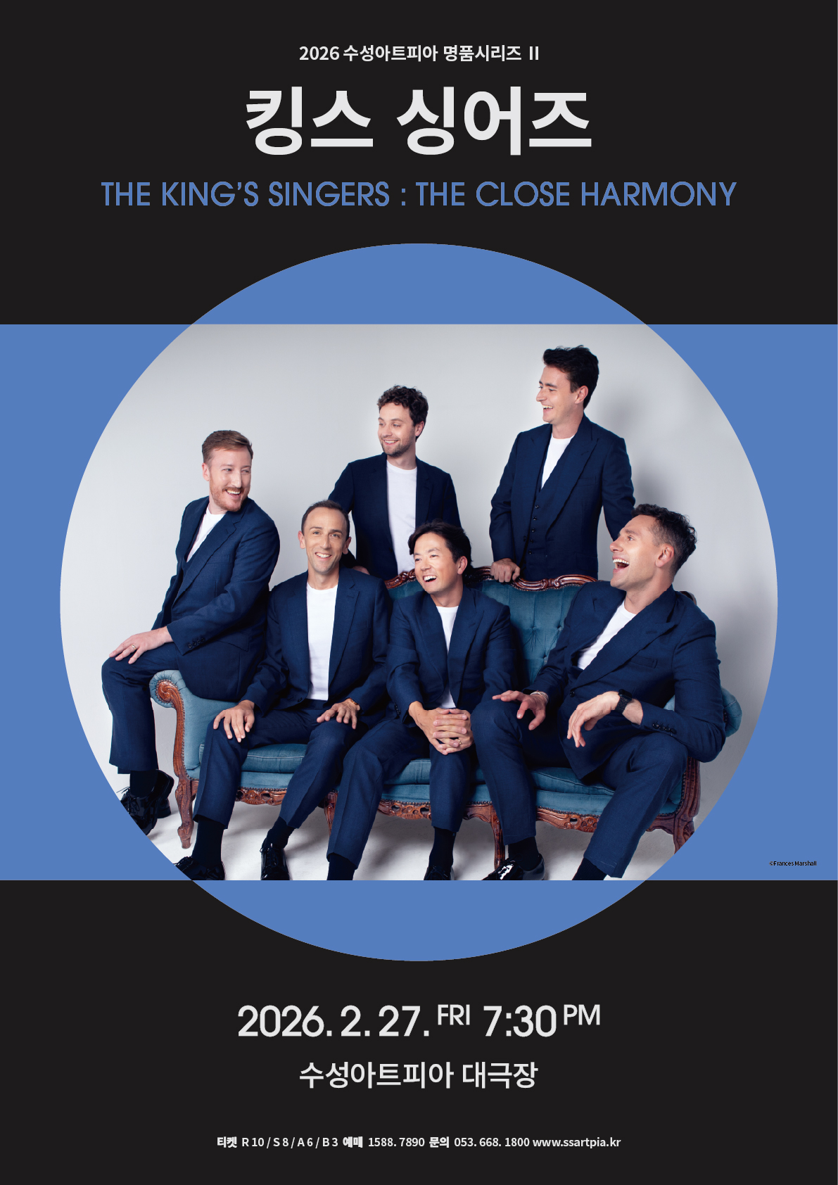 킹스 싱어즈(The King’s Singers)는 1968년 케임브리지 킹스 칼리지 출신 여섯 명의 합창 장학생이 결성한 세계 최고 수준의 아카펠라 앙상블이다. 두 명의 카운터테너, 테너, 두 명의 바리톤, 베이스로 구성된 독특한 편성을 55년 넘게 유지하며 아카펠라 음악의 기준을 제시해왔다. 르네상스 음악부터 현대 클래식, 팝과 영화음악에 이르기까지 폭넓은 레퍼토리를 통해 장르의 경계를 확장해왔다. 두 차례 그래미상, 에미상 수상과 그라모폰 명예의 전당 헌액 등 국제적 명성을 지니고 있다. 20~21세기 주요 작곡가들로부터 300곡 이상의 신작을 위촉하며 합창 음악의 레퍼토리를 확장해왔다.