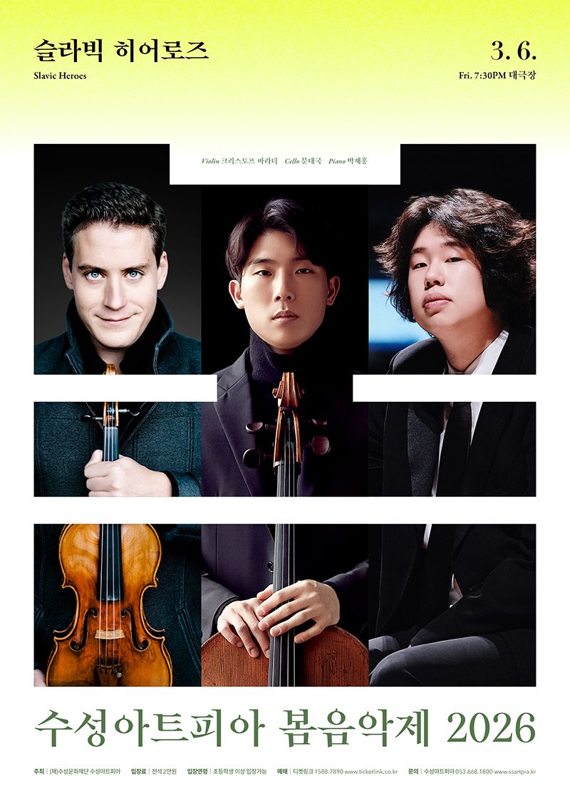 독보적인 비르투오소 크리스토프 바라티, 깊은 사유의 첼리스트 문태국, 압도적 타건의 박재홍. 세계 무대의 중심에 선 세 명의 연주자가 모여 낭만주의 피아노 트리오의 정점을 노래한다. 라흐마니노프, 드보르작, 차이콥스키로 이어지는 이번 무대는 동유럽 실내악의 정교한 구조미와 폭발적인 감정선을 생생하게 구현한다. 완벽한 테크닉과 깊은 음악성이 만나는 ‘Slavic Heroes’, 피아노 트리오의 진정한 매력을 깊이 있게 탐색한다.