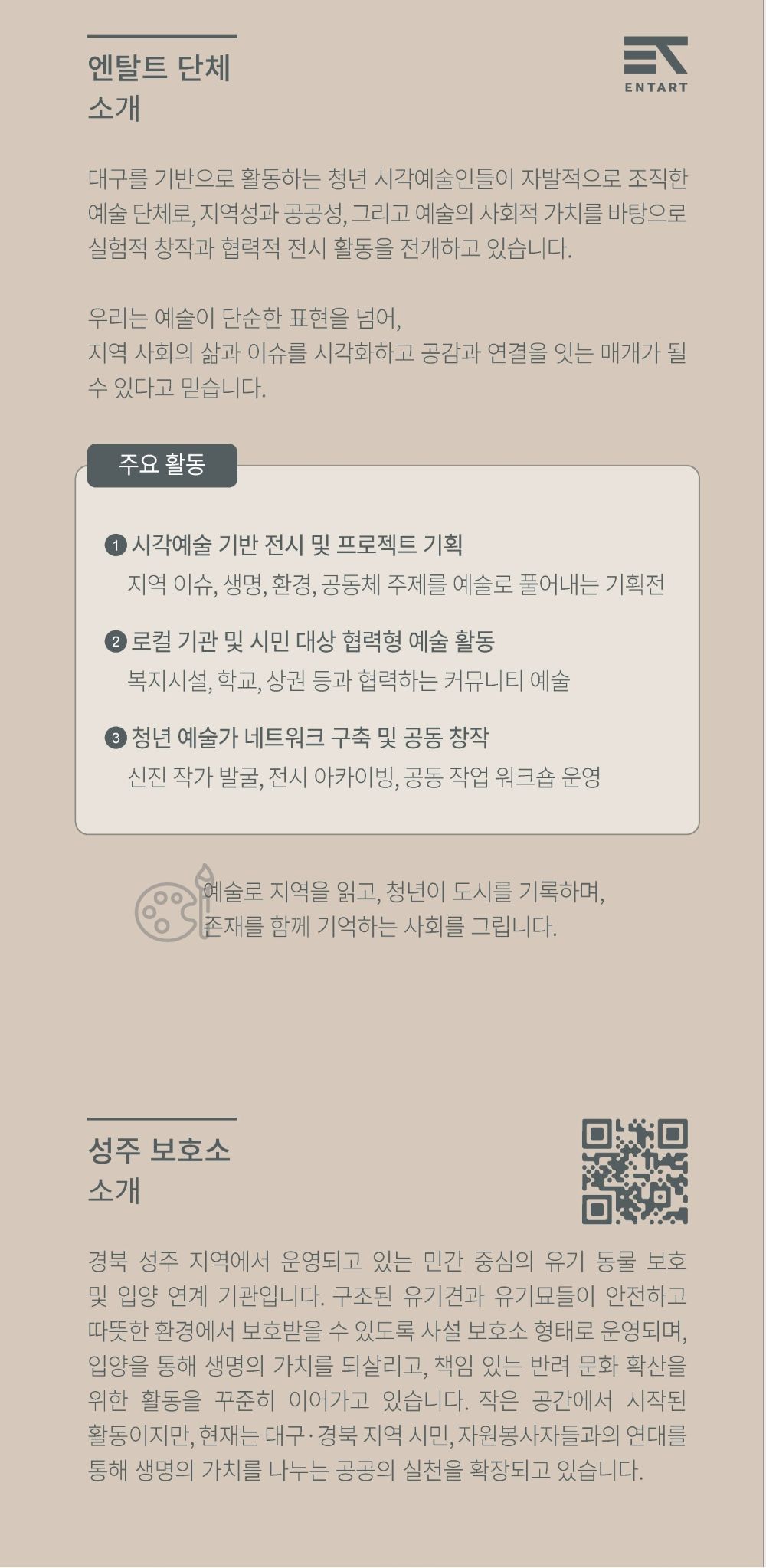 지역 예술인 들이 서로 소통하고 협력할 수 있는 플렛폼을 제공하며, 예술 활동을 통해 사회적 가치를 창출 할 수 있도록 지원하는 활동을 하고 있다.