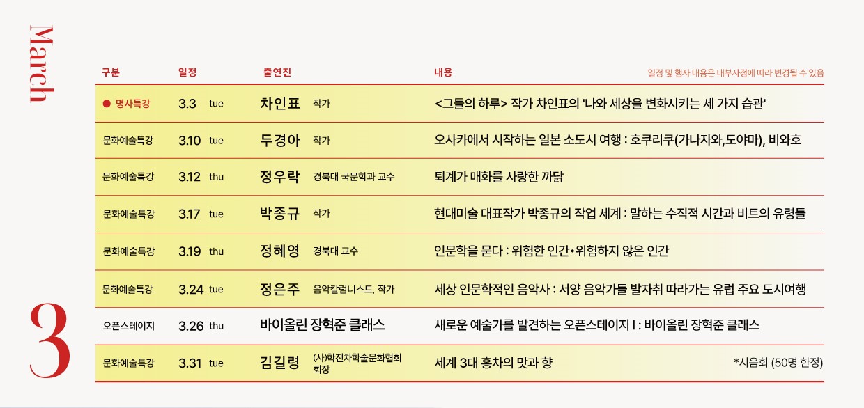 - 강연 당 선착순 100명 한정 / 1인 1매 신청 가능, 프로그램 복수 신청 가능